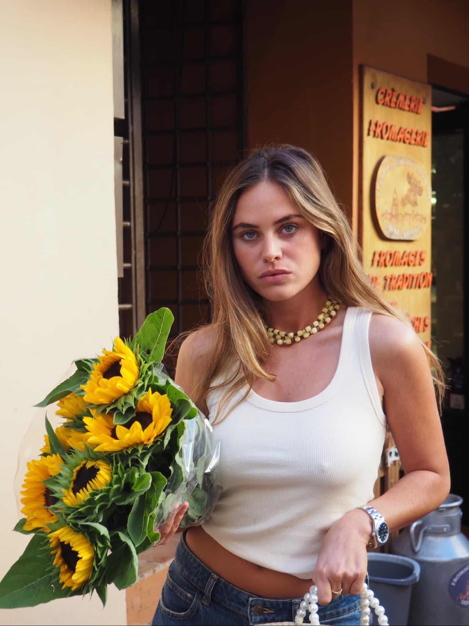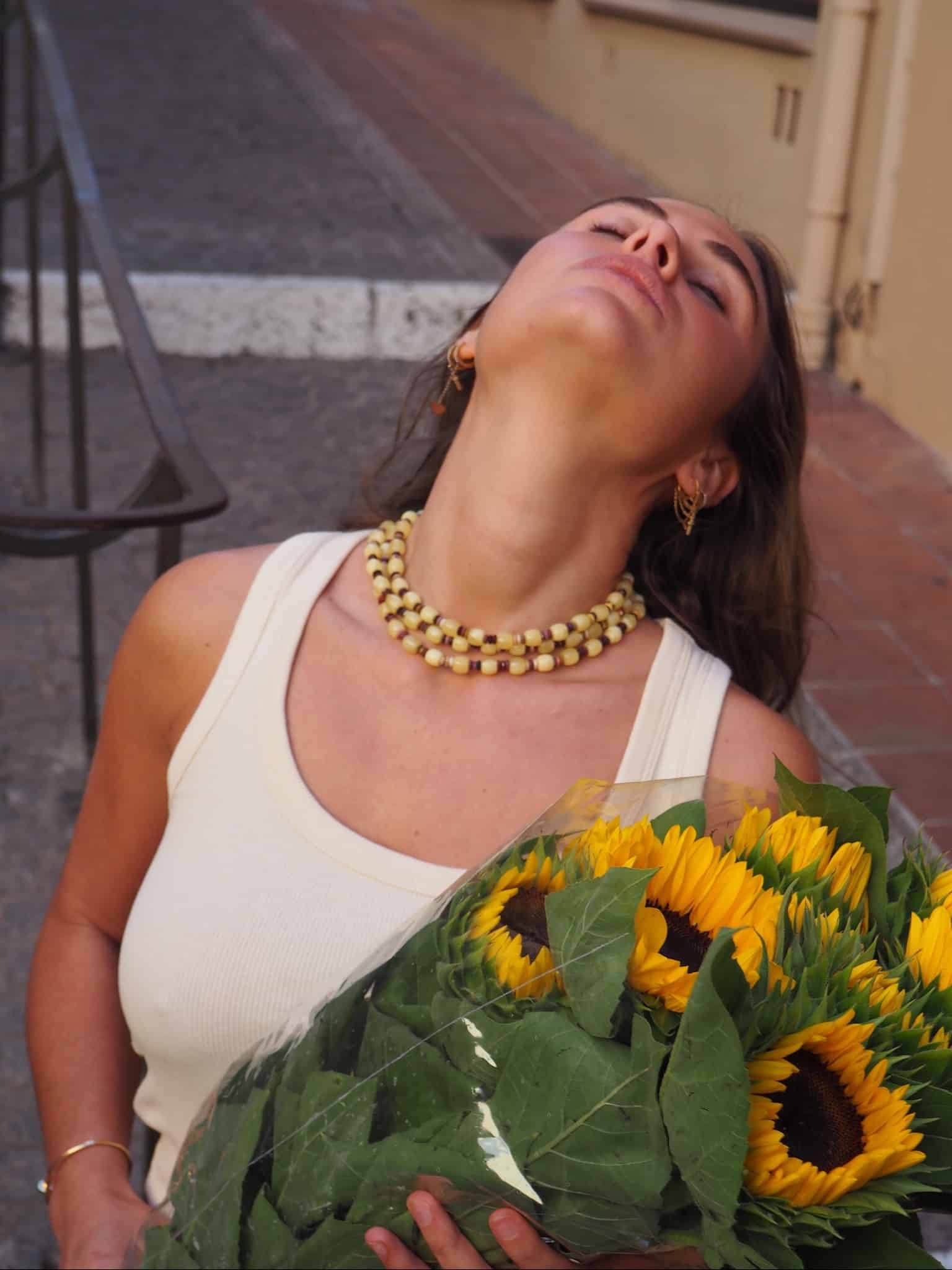 Le collier « Marché », façonné à la main en perles naturelles jaunes, s’inspire du marché ensoleillé de la Place des Lices, cœur vibrant de Saint-Tropez. Il évoque les étals débordant de citrons, de fleurs fraîches et de tissus colorés, les rires qui s’élèvent sous les platanes, et l’odeur mêlée du savon et du pain chaud.