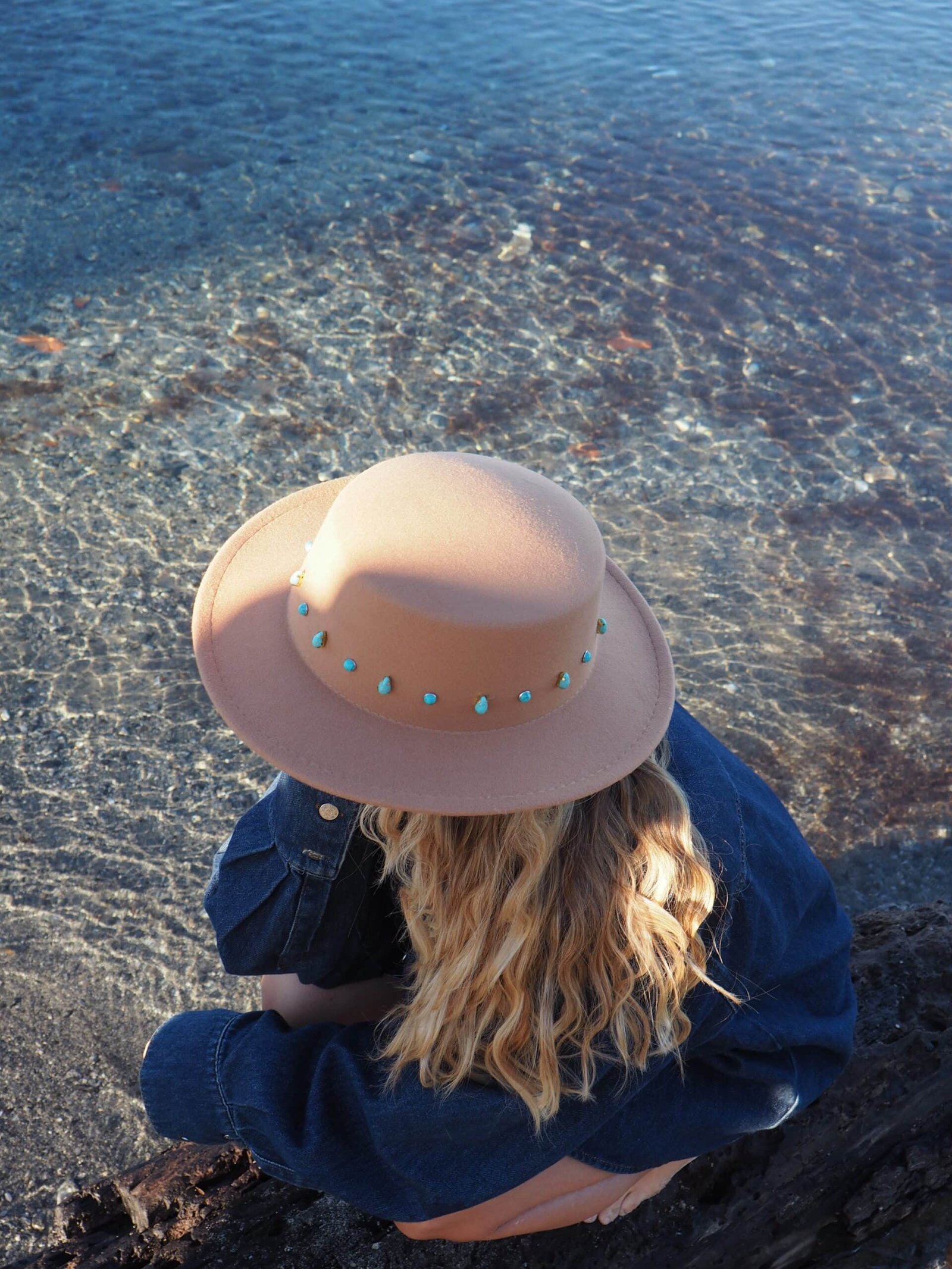 Des rivets dorés et des pierres turquoise posés à la main rappellent les reflets du soleil sur la mer d’hiver.
